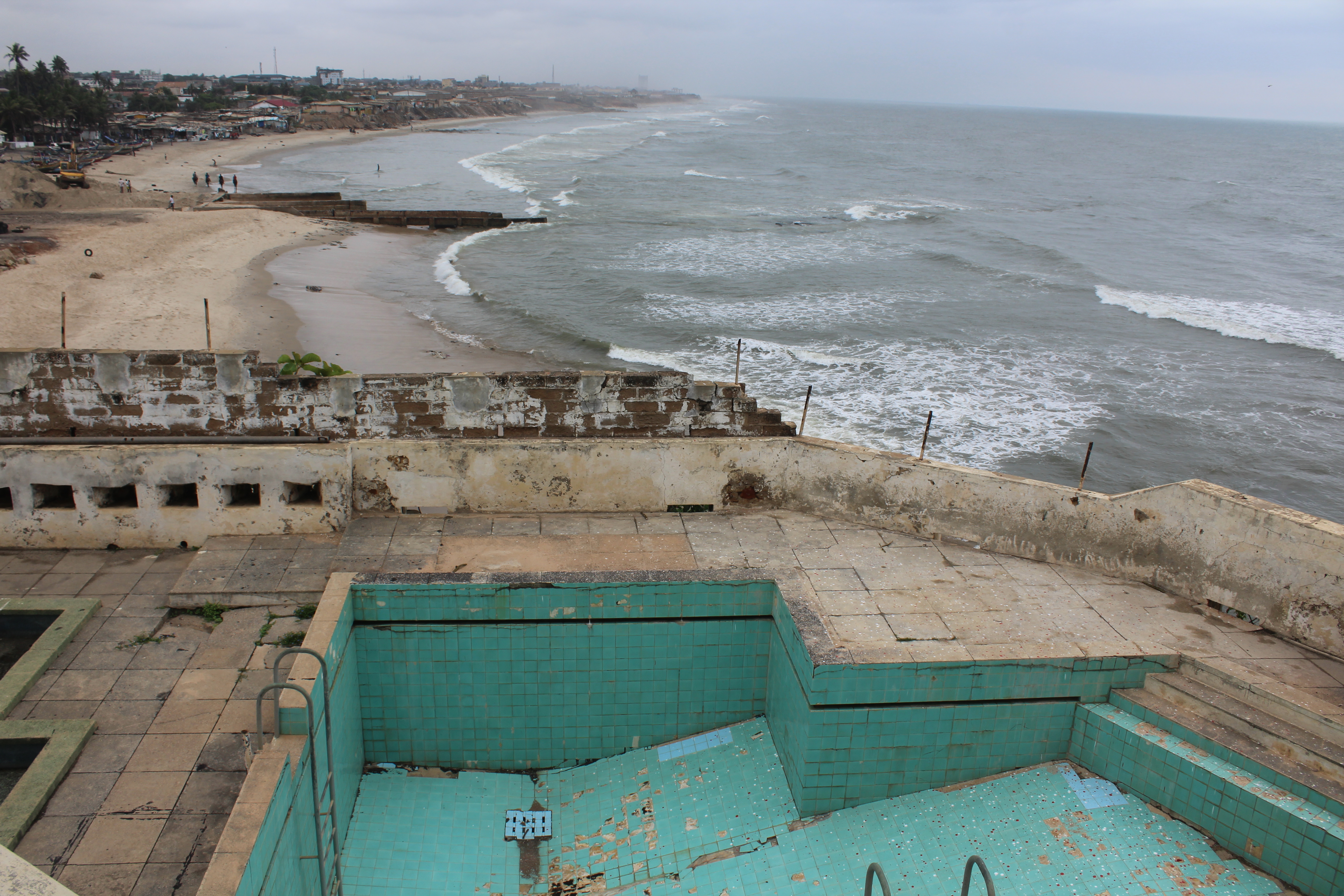 The empty swimming pool was built in the days of Ghana governance but is now empty and abandoned. With a view to the beach and village below I ponder on what it was like when in use for a cool-off in the relentless heat of this country, who used it and what were their thoughts looking down at the poverty of the township below?