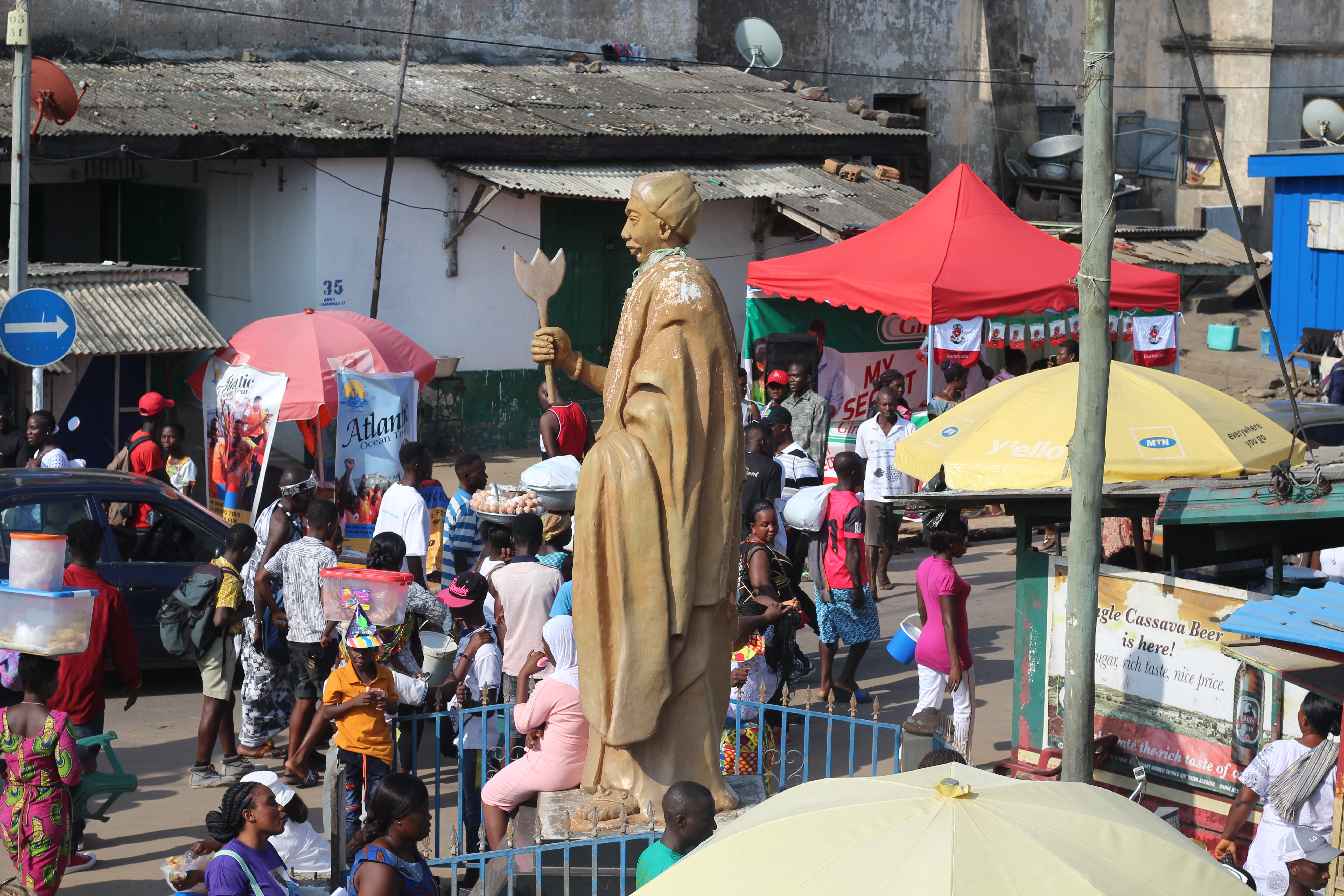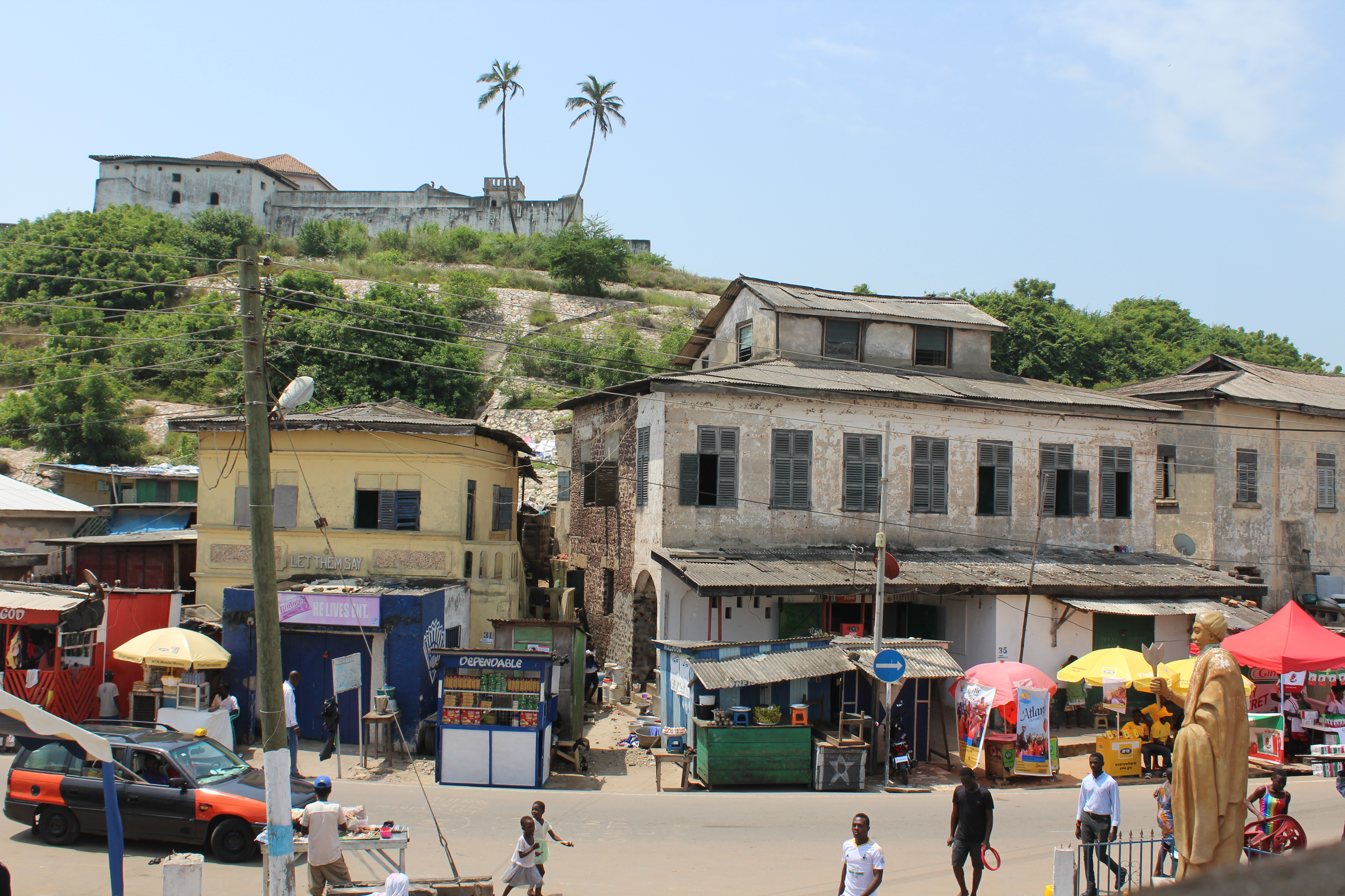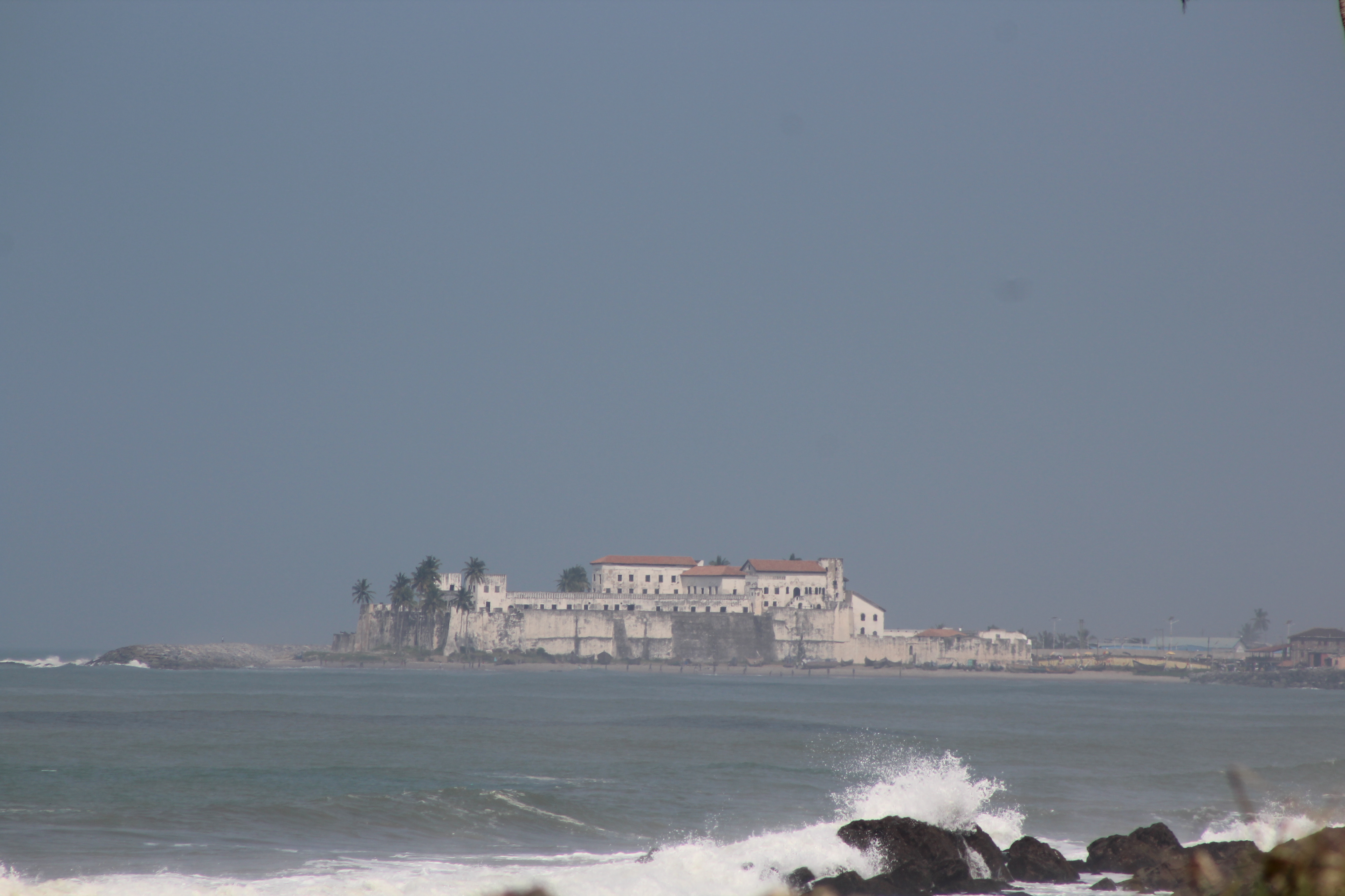 Suddenly we know we are close to our destination as we see the sea, and waves crashing against the rocks, and through the thick salty haze, the white Elmina castle comes into view on the horizon. Framed by palm trees in the foreground, this structure built by the Portuguese in 1482 that appears small from this distance, played no small role in the history of the transatlantic slave route. At the height of the trade 30 000 slaves were passing through the castle each year, and this continued for 300 years.