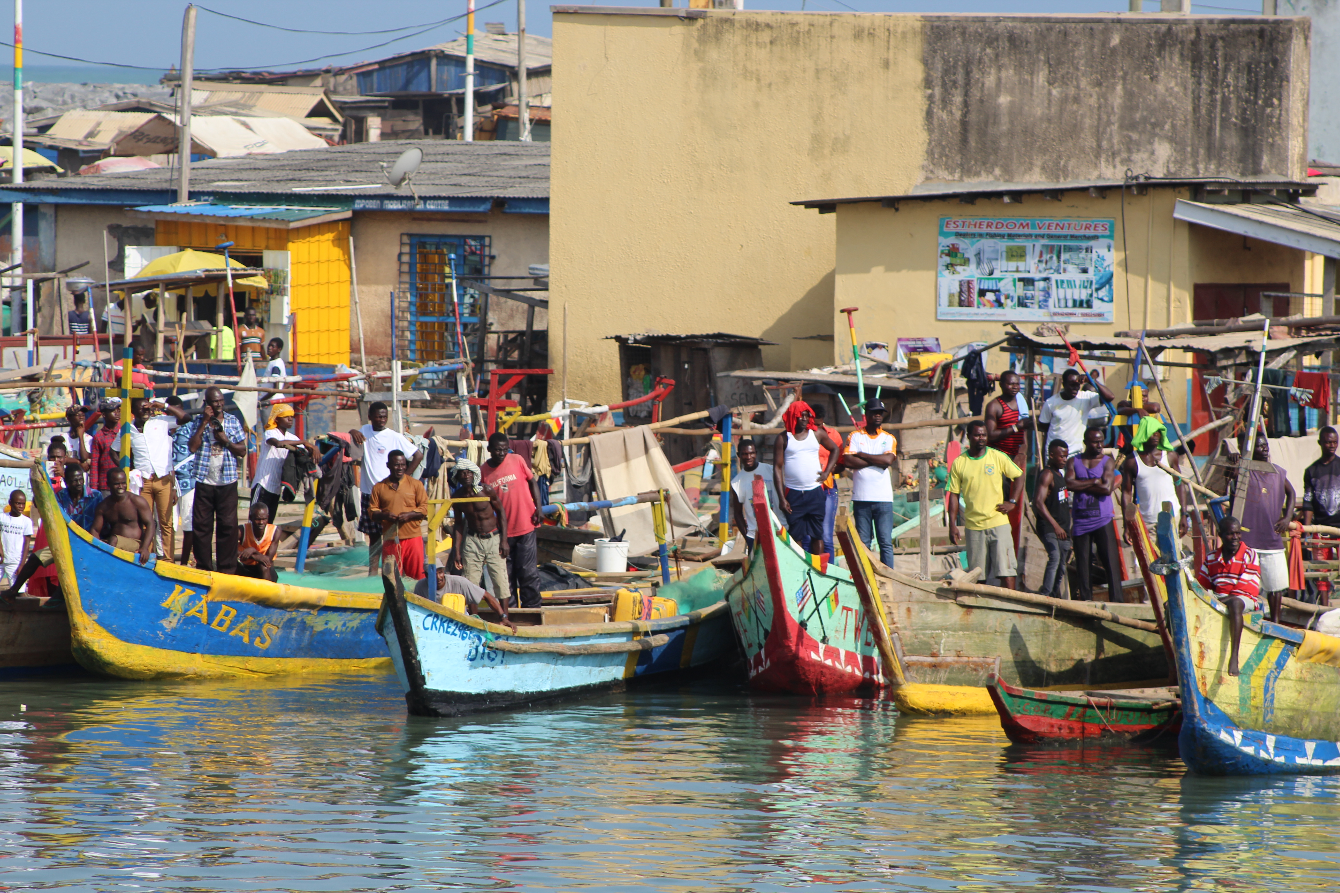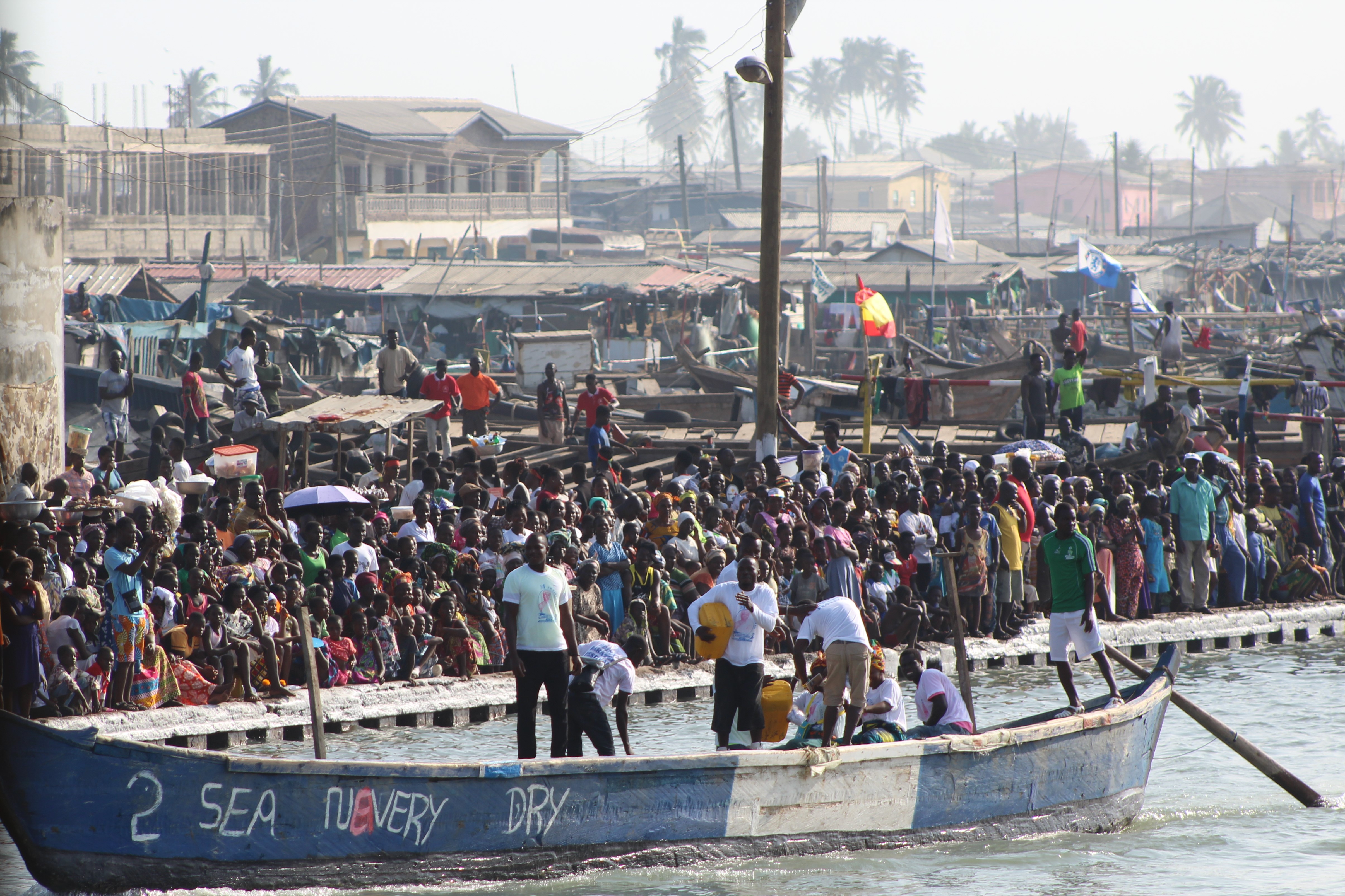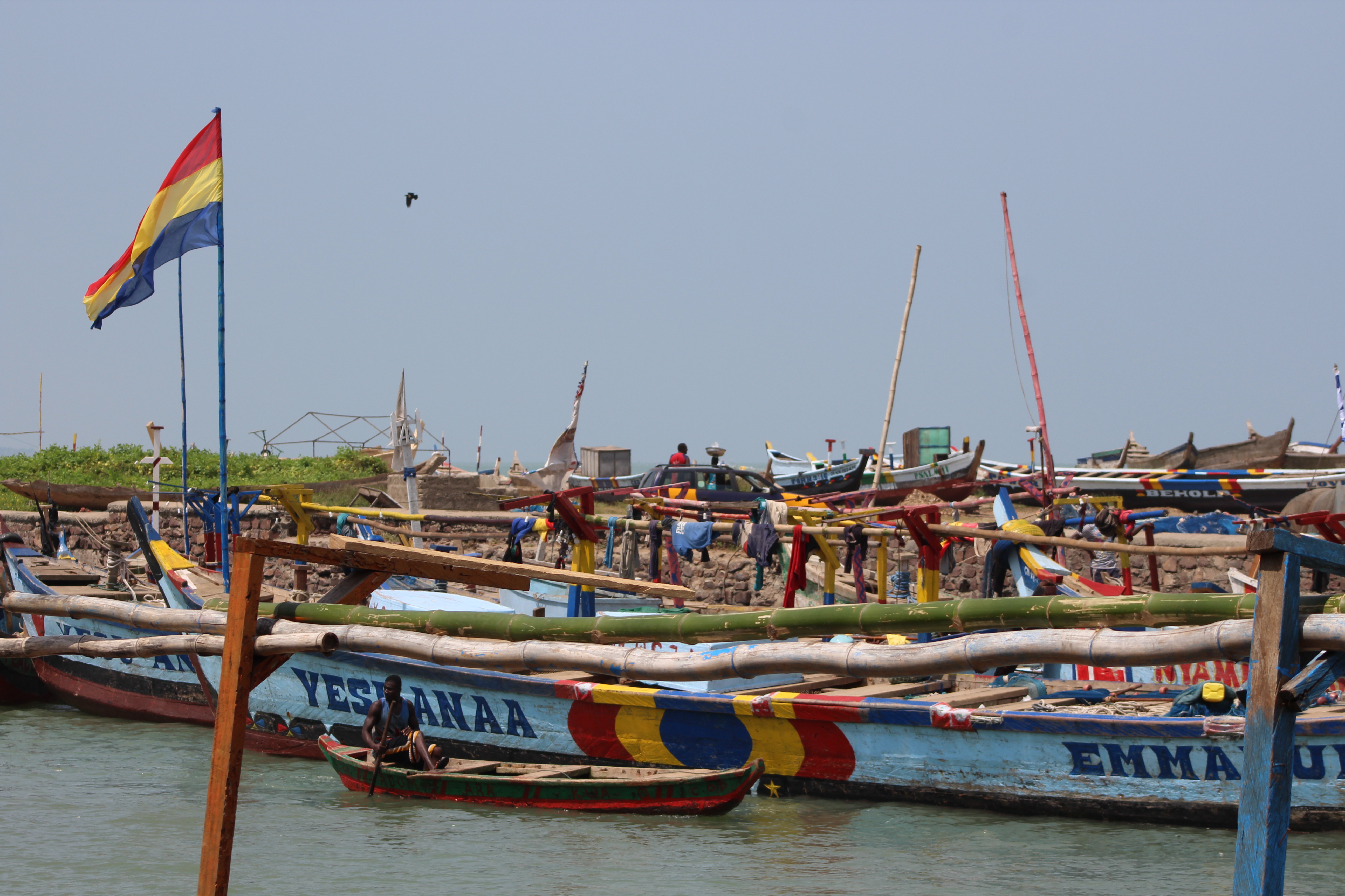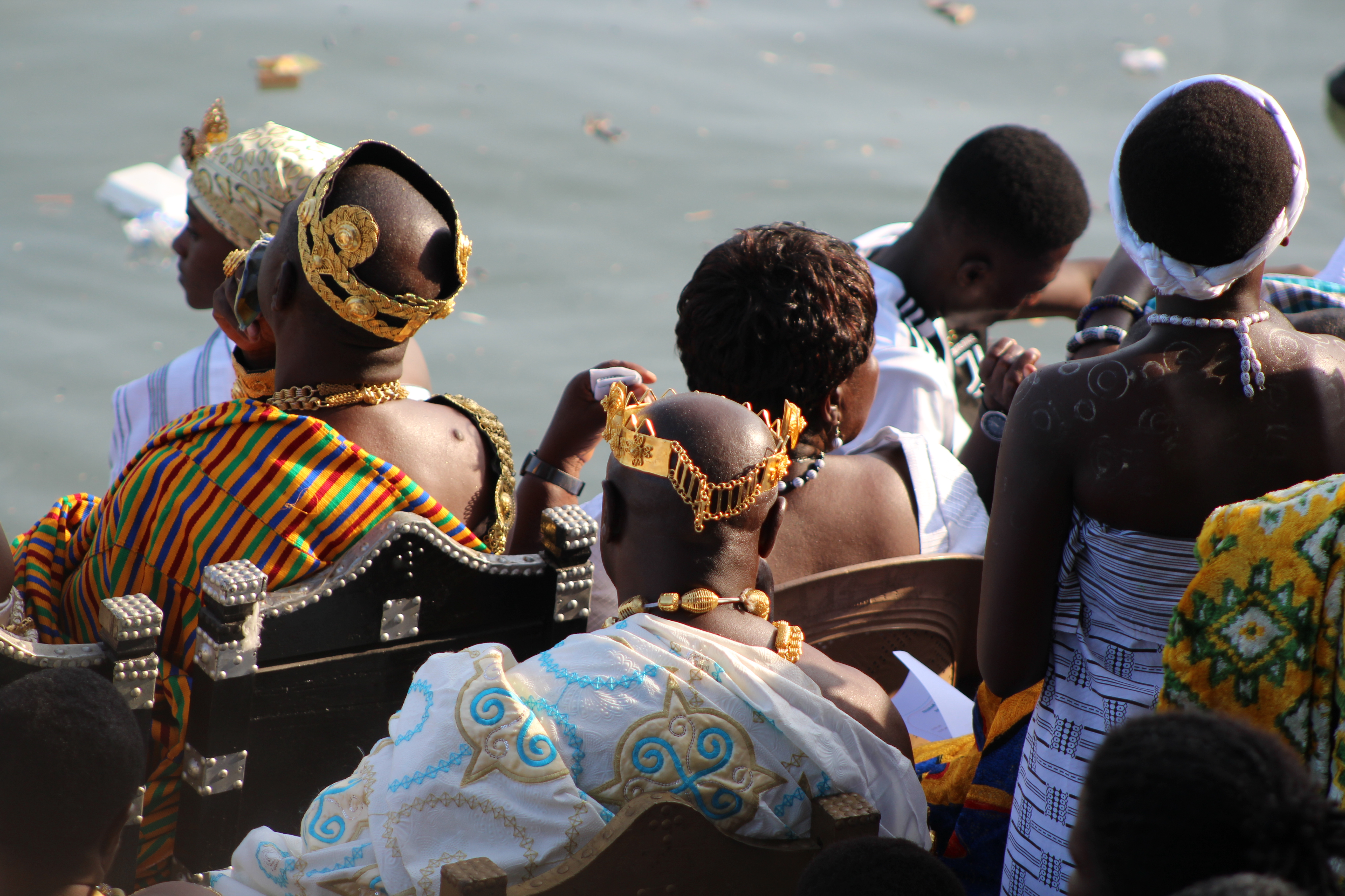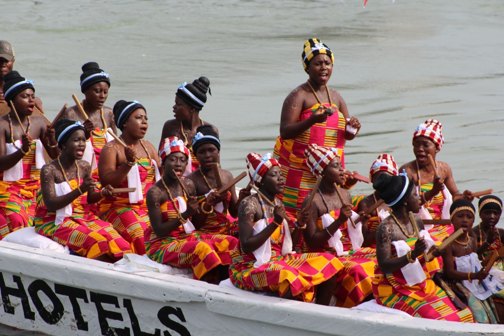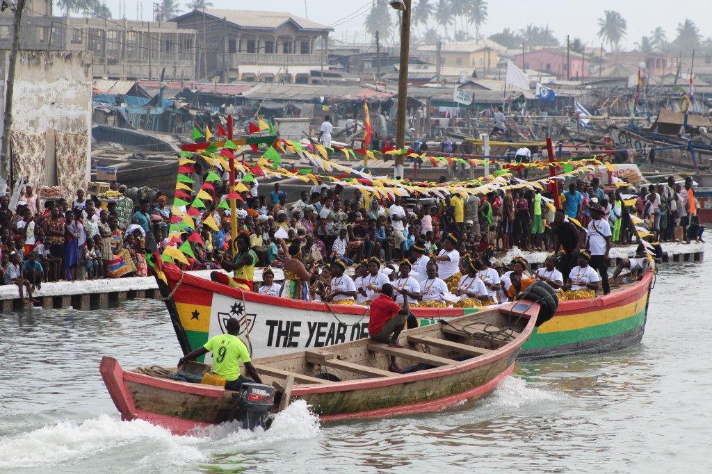 The crowd stirs and excitement rises when colourful canoe boats start to enter the lagoon, with flag bunting swaying in the breeze, men and women on the boats in matching Ghanaian fabric outfits sing and dance. Some wave white handkerchiefs in the air, others play drums and rhythmically knock wooden instruments together. The boats gently sway with all the movement, but are kept in balance by the well distributed dancing crew. The musical beat grows faster and the men paddling in smaller boats begin to do with more zeal, their muscular physiques rowing together like wheels on a train moving in perfect unison. At certain times it seems like the boats may collide and the crowd takes a breath in, but in the nick of time the rudders are turned and they smoothly glide past each other like shoals of fish in the ocean swimming so close but never touching.