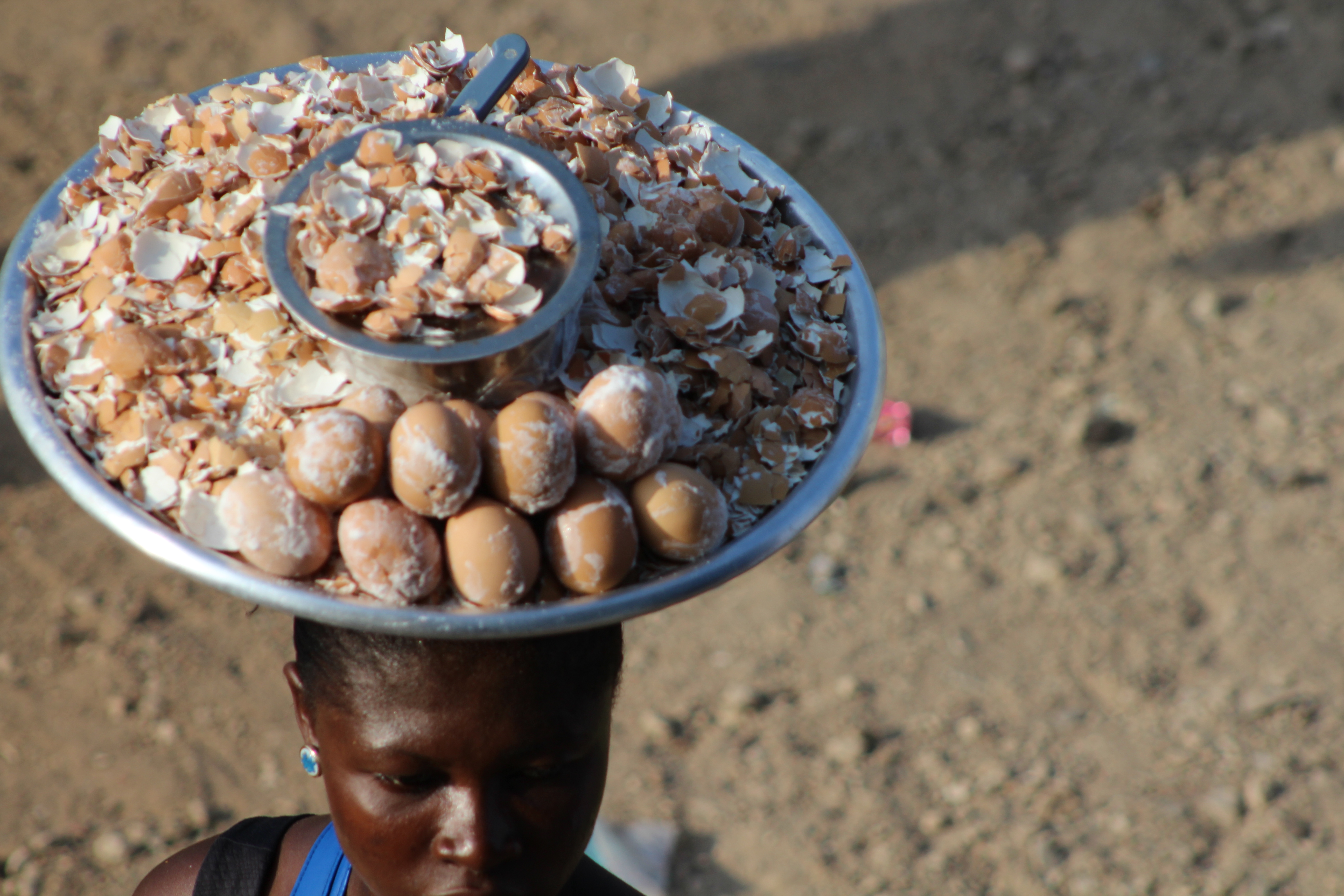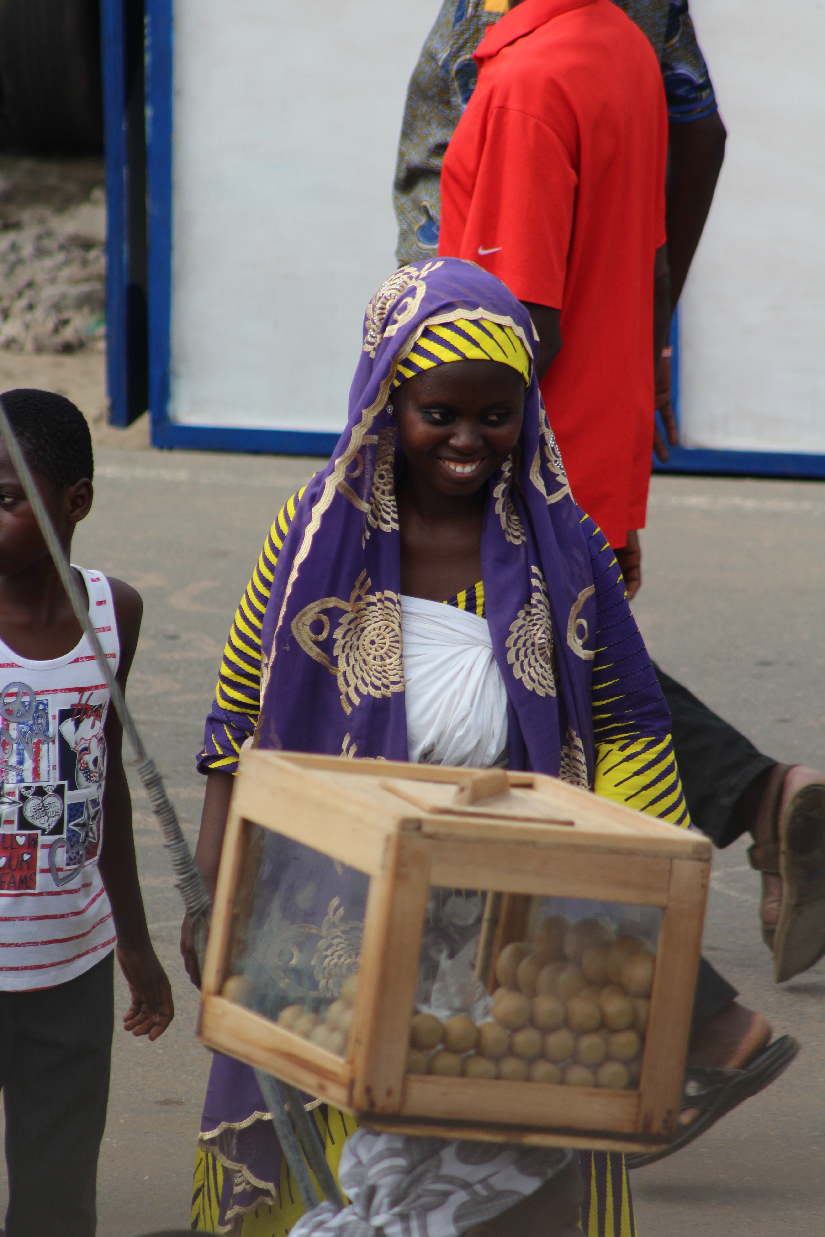No one will go hungry with ladies selling refreshments below us in great big metal bowls on the top of their heads. On sale are milky drinks, dried fish, fried cassava balls and plantain, cool drinks and boiled eggs with a bowl of salt on the side for sprinkling. Then a man in the front starts ringing a bell, reminding me of the old Saturday morning trips with my mom for groceries, where the lady stood ringing her bell to alert you to the specials. He is trying to sell a pair of light turquoise patent leather high heels!!!! Any takers?! 🙂
