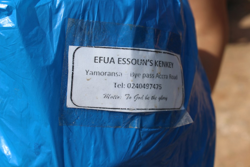 Fante Kenkey is kneaded corn dough cooked in dried plantain leaves and is an enjoyed staple food in Ghana. The blue plastic wrapping means it is the special type of Kenkey of the Fante people in this region. Hungry travelers stop by the taxi load to buy it and the ladies selling it remember the faces of their customers and loyalty to the same lady is most important!! (don’t you dare forget her name!)