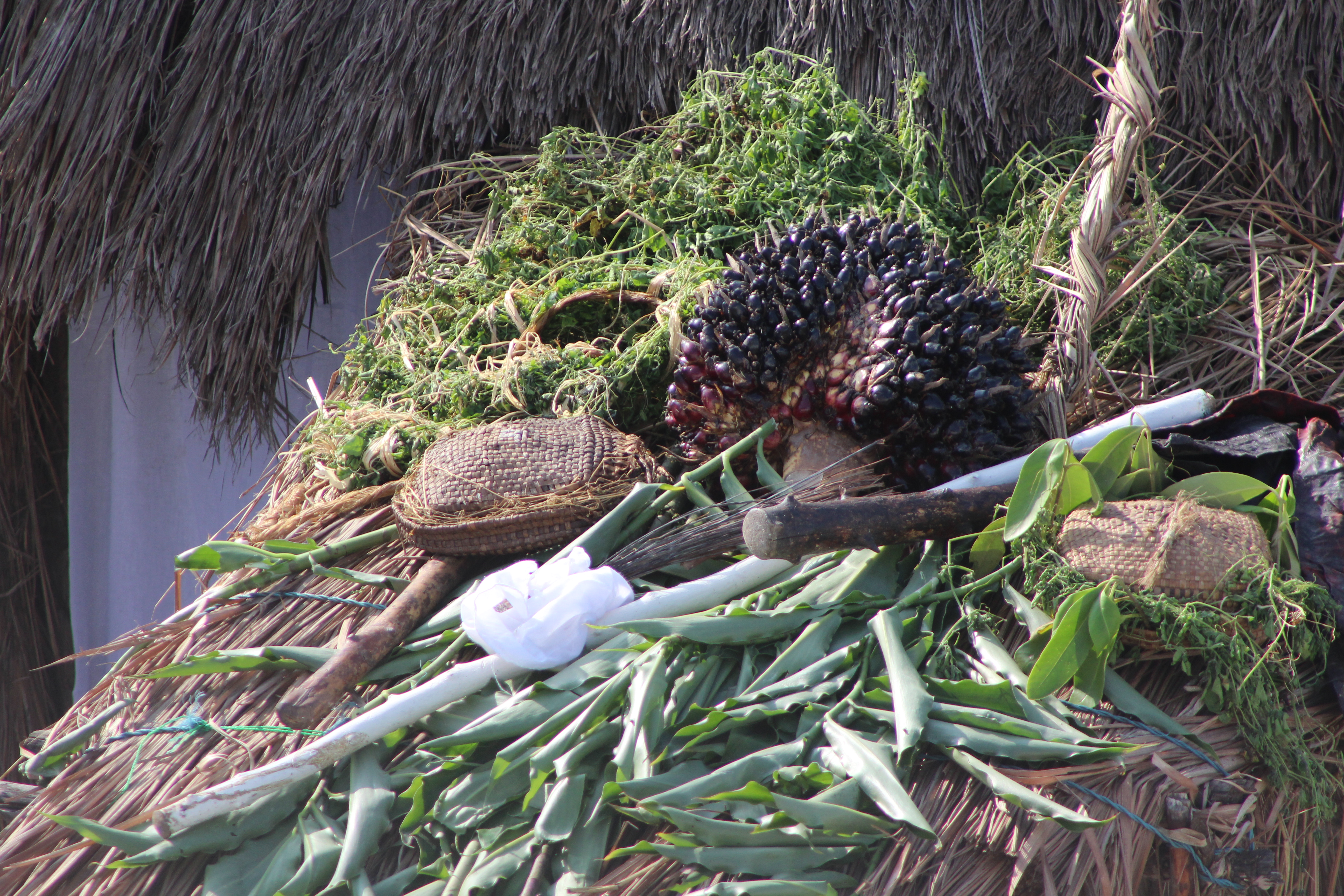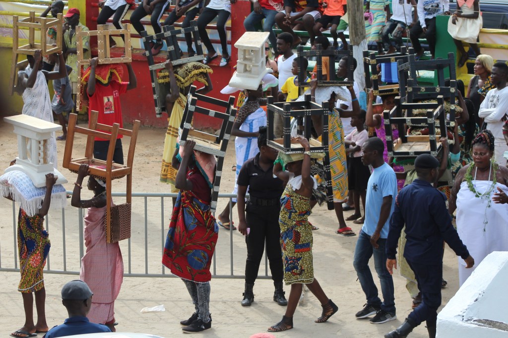 Then there is more activity from behind. We hear cheers of anticipation. A long line of young women carrying wooden chairs on their heads is heading towards the lagoon area. These chair carriers are leading the royal procession, as Nana Kodwo Conduah VI, the Paramount Chief of Elmina, his sub chiefs and elders of the traditional council make their way from the royal palace, to the Shrine. The priests and priestesses are dressed in white with crowns of leaves on their heads, and they lead the way to drive out any evil spirits that may want to attack the Chief. They enter the Shrine area and gather there playing instruments and performing the necessary rituals and prayers to offer the sacred food of eggs and mashed yam mixed with palm oil, to the Benya deity.