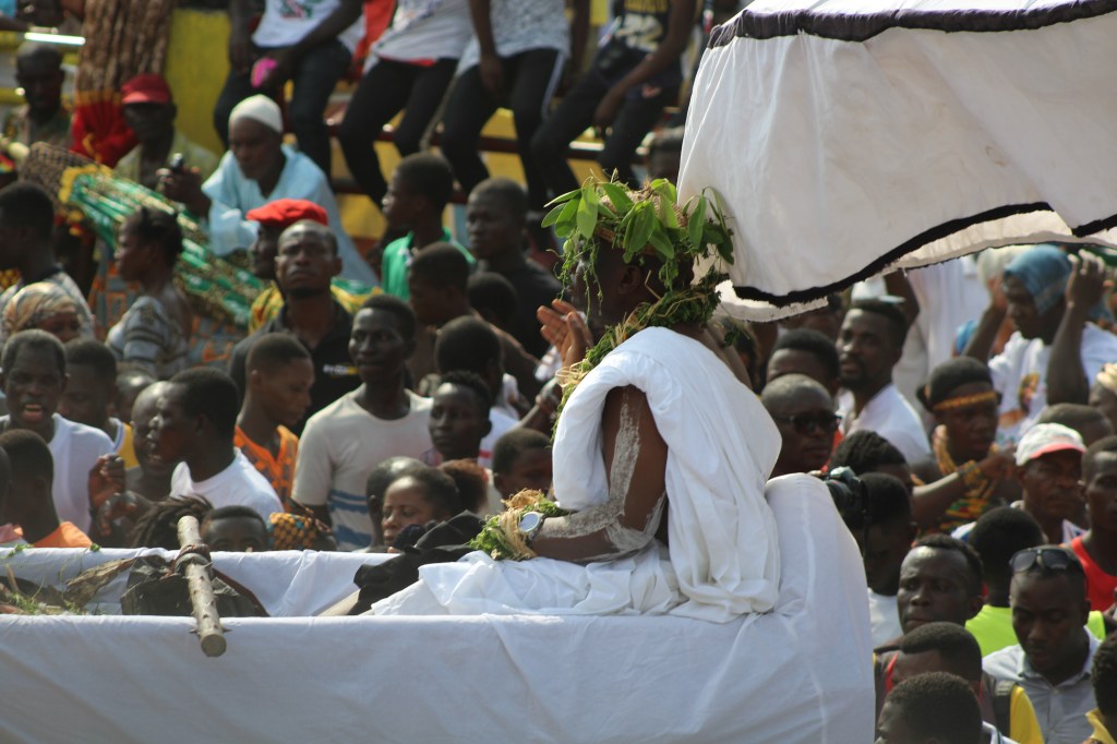 In the annual tradition, the offering to the deity which looks like a leafy wreath with dark berries, is bought from the shrine area, and men swim with it into the water of the lagoon. The lagoon ceremony then reaches a crescendo with one of the priests rowing to the middle of the lagoon to cast his net. The crowd is quiet and anticipatory, the result of this first fishing activity in six weeks is a telltale sign of the season to come – if it’s good the people of Elmina can bank on a plentiful year ahead. The priest stands on the edge of the canoe, his lithe body twists in an action that is clearly second nature to him, and the bundled up net in his arms opens up, spreading itself wide – hungry for the fruits of the lagoon. Momentarily, concentric circles of the translucent net can be seen in the air, just before it hits the water. Then we wait….