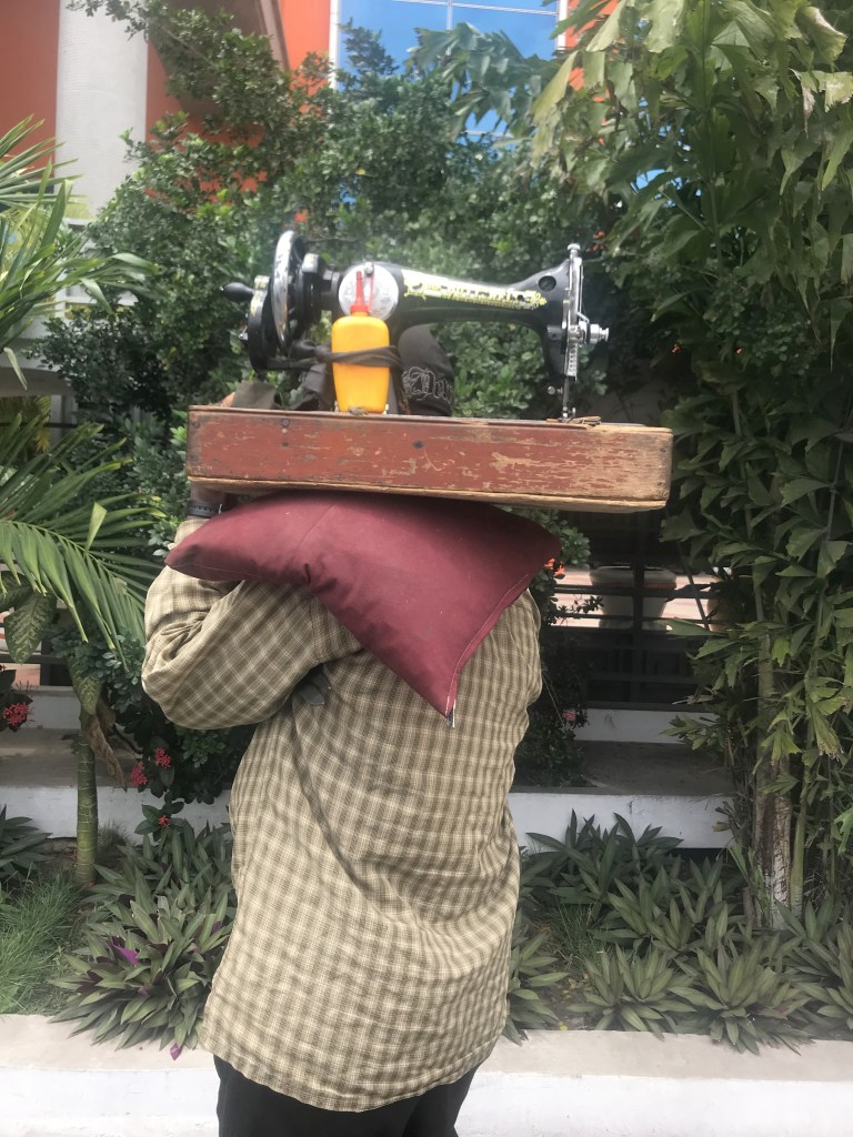 I exit the school gate and see a tailor walking along the road, sewing machine balanced on his head as he imitates the act of cutting with his large pair of silver scissors. Just like the old ice-cream van playing a familiar tune on a weekend, causing us to immediately shout to our parents for some coins, and run outside for a refreshing treat, this man is hoping that the snipping of his scissors will alert anyone who is in need of clothing alterations or a new garment to be sewn! “Snip Snip Snip” – he is his own walking advert!