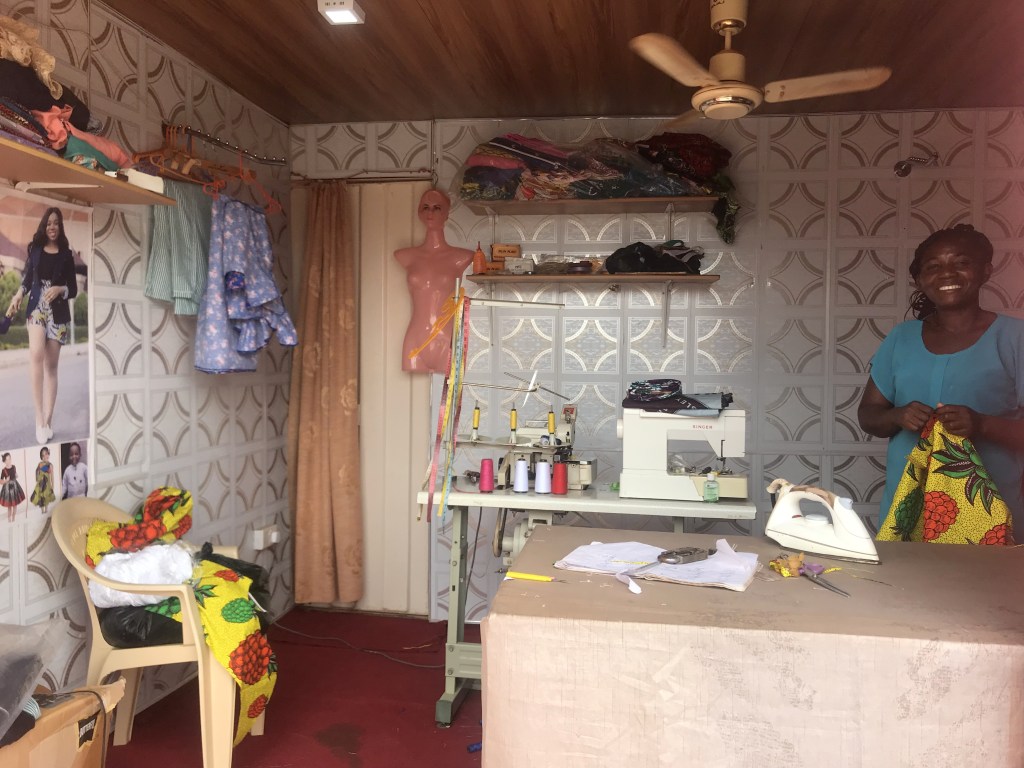 He was the first of many sewists (a term that combines the words ‘sew’ and ‘artist’ and refers to anyone making sewn works for art) I see daily here who are running tailoring and dressmaking businesses either from container shops, if they are privileged, or sewing on the side of the road under the shade of an umbrella or tree, or sometimes even just in the (almost) equatorial scorching sun. Converted shipping containers line the streets of Accra and take the form of little food stores, African hair salons, plastic goods shops, vegetable shops and in this case spaces where ladies and men sew clothes. Some have electricity but it is not the norm so most of the time cooldrinks and food are sold at room temperature.