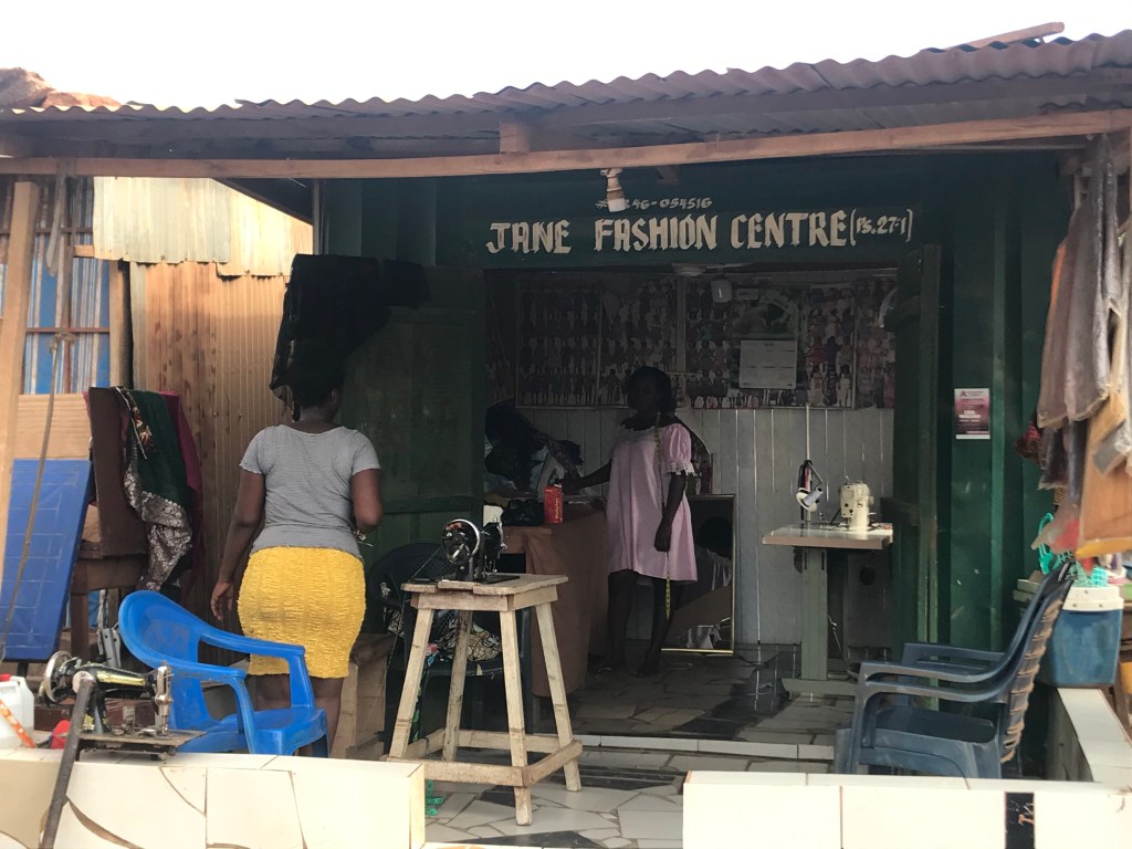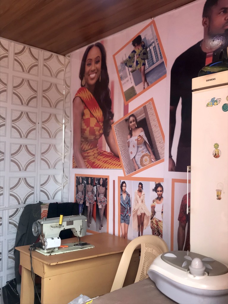The walls are usually adorned with Ghanaian sewing posters with models wearing many different traditional Ankara African dress styles, and the idea is that a customer comes into the shop and chooses their style of dress that they wish to have made, from the options on the posters.