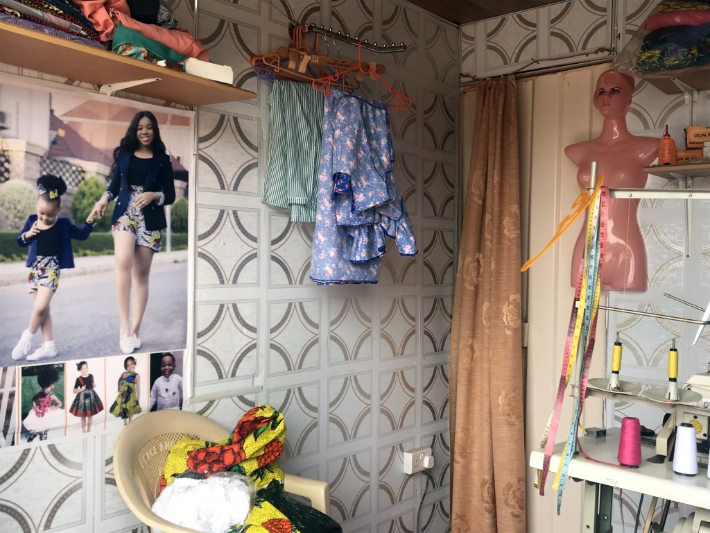 I recall the first time I caught a glimpse of a lady sewing in a small container shop on the side of the road. On this day I was in the passenger seat of the car and we were driving past a row of these shops and I caught sight of her sitting in her sewing machine in her cosy sewing space. At the time it felt like a holy little moment seeing her, as I could remember what it was like to sit at my sewing machine and I had not ever seen someone sewing in such a small, unique space before. As we were very new to Accra, I didn’t realise then that it is common here for those who sew to offer their services from their container ‘Fashion houses’, and I still love spotting these small businesses which usually overspill onto the pavements with sewists creating garments on the pavements with their portable sewing machines.