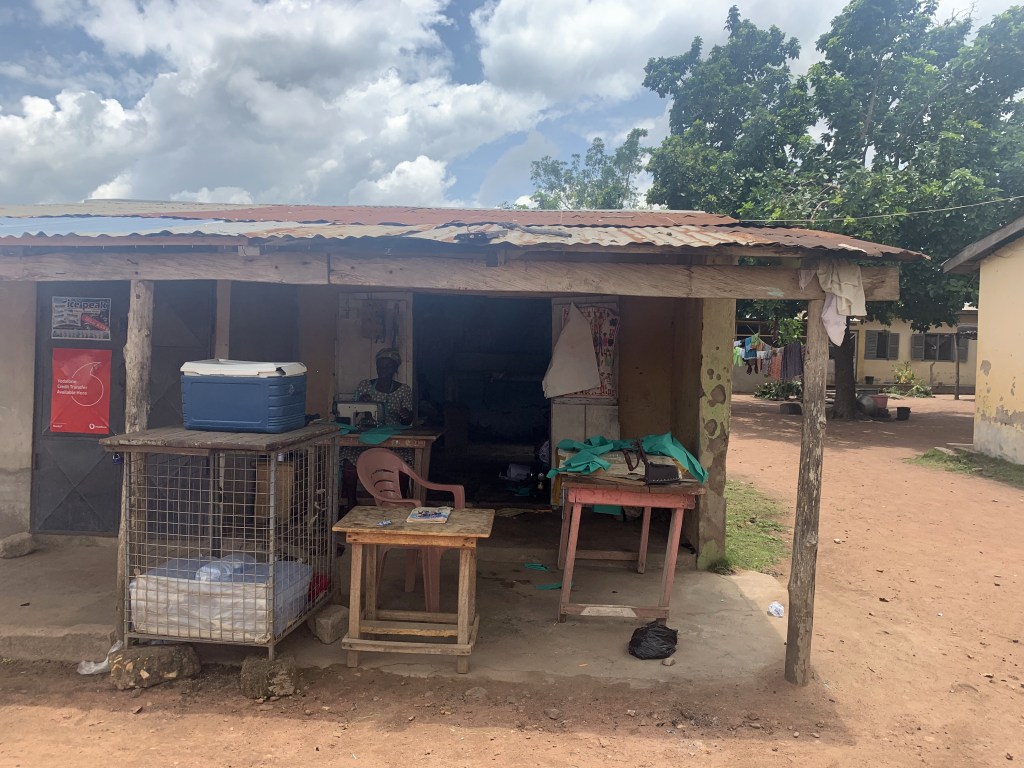 Veronica is a Ghanaian lady who owns a little ‘tuckshop’ near our children’s school. When we drive past her store several times a day, I peek into her rhythmical routine of walking to buy street food nearby, selling something from her store, sweeping the sandy ground outside her shop with a palm leaf broom and occasionally napping on her bench. Often she is sitting at a basic handmade table outside her shop with her manual machine and gives me a big wave as we drive by. Domestic and working life seem to tumble from the roadside onto the road.