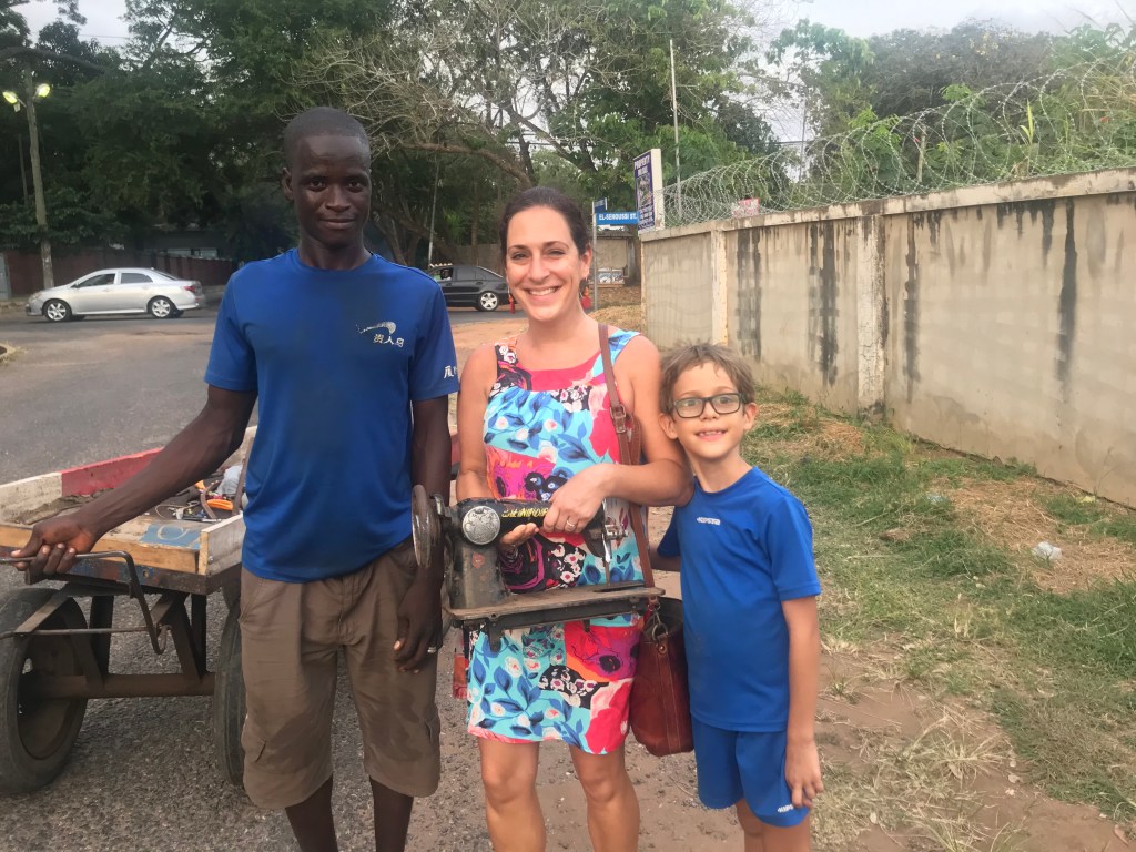 On our first Saturday in Accra as a family, back in April 2016, we took a walk from our home to busy Oxford Street in Osu. On the way we encountered a tailor fixing a lunch box. His broken-slop-covered-foot moved to power the pedal of his manual machine and on this hellishly humid day in April he sat under the shade of a tree earning a few Cedies through mending and making. I treasure this photo and have it hanging in my sewing space at home.