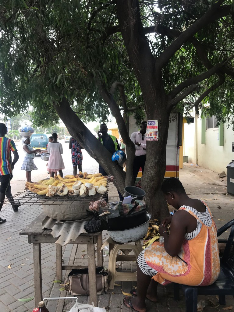 The midday heat is intense and we are so happy to spot a lady with a big metal bowl on her head, the colourful cooldrink lids peeping out from the rim are promises of that wonderful burny sip of icy cold Coke when you need it most! She places her selection of drinks that she carries in cold water on the floor, next to her stars and stripes scarf that is rolled into a doughnut like shape to enable her to balance this heavy weight on her head. On Ghana’s Independence Day the irony of another emblem of far wealthier Independence doesn’t escape me in that moment. The sweet smell of coal roasted plantains fills the balmy air. There are only two Cokes available but Emma and Jack are happy with most fizzy, sugary options on offer and we carry on, grateful for the cool refreshment.