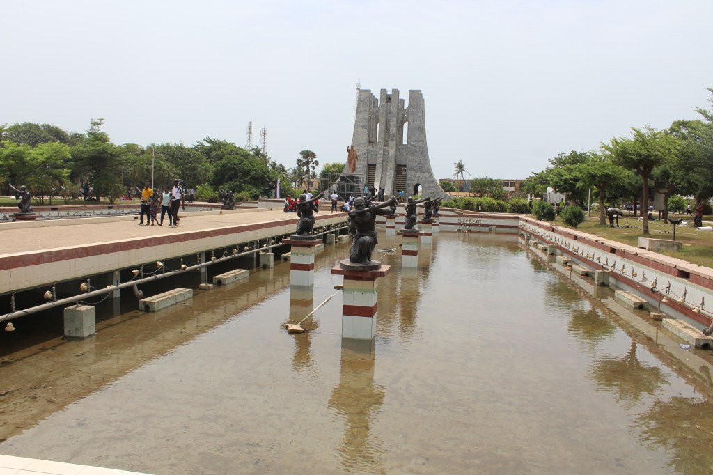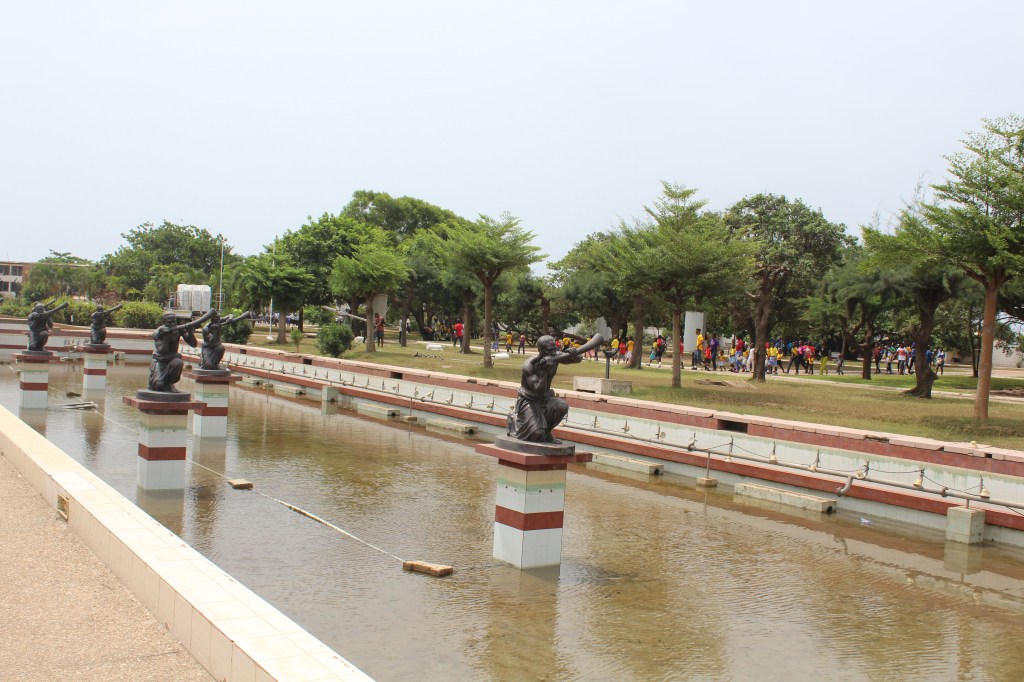 We enter the park and approach the Mausoleum, which houses the bodies of Ghana’s first president and his wife Fathia Nkrumah. The pathway we walk along is flanked by two springs of water, symbolic of life, and sculptures of men who are blowing flutes.
