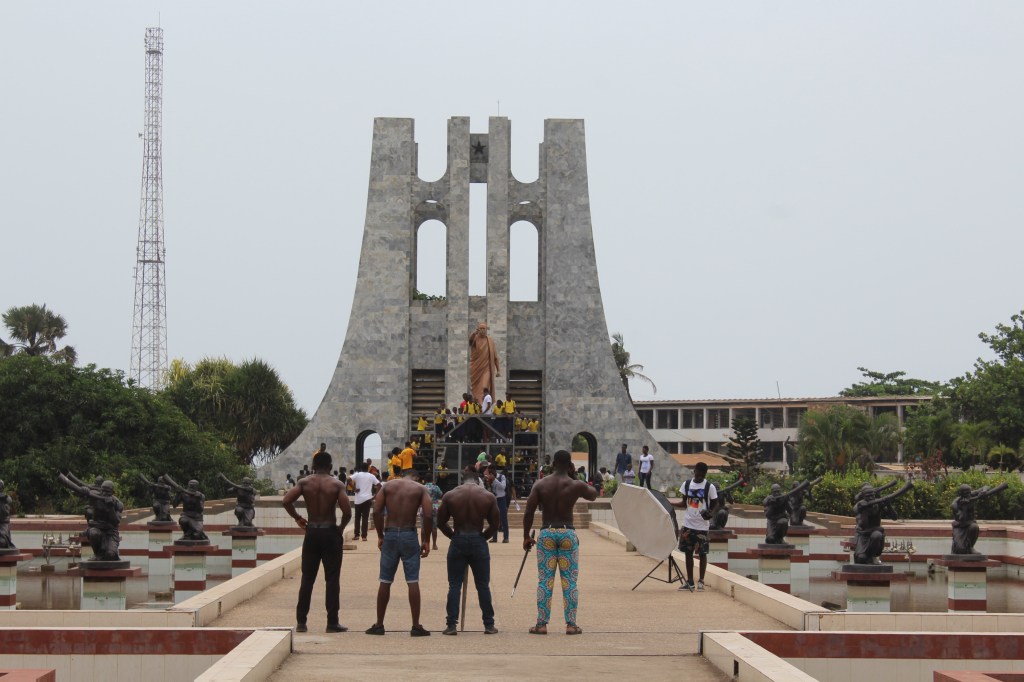 One thing I love about Ghana is the warm welcome you always get when you arrive somewhere and today is no different as in Ghanian culture flutes are blown on special occasions and to welcome dignitaries. “You are welcome” is what we hear when we enter a shop, a restaurant or return home from a trip upon seeing our domestic helper and driver for the first time again. When our parents and friends have arrived to visit us here, I’m always so heartened to hear the lovely “Akwaaba” as they enter our compound and home, which is the local Twi welcoming word. From photos I have previously seen, the sculptures of these bare-chested men blowing their flutes are meant to blow fountains of water, but on the day we visit the water levels are very low in the springs. These aren’t the only bare-chested men around as there is a group of body builders with their shirts off posing for what is likely their Independence Day ‘Instagram shoot’ in the same pose as the big bronze statue of Kwame Nkrumah with their hands triumphantly pointing to the sky!