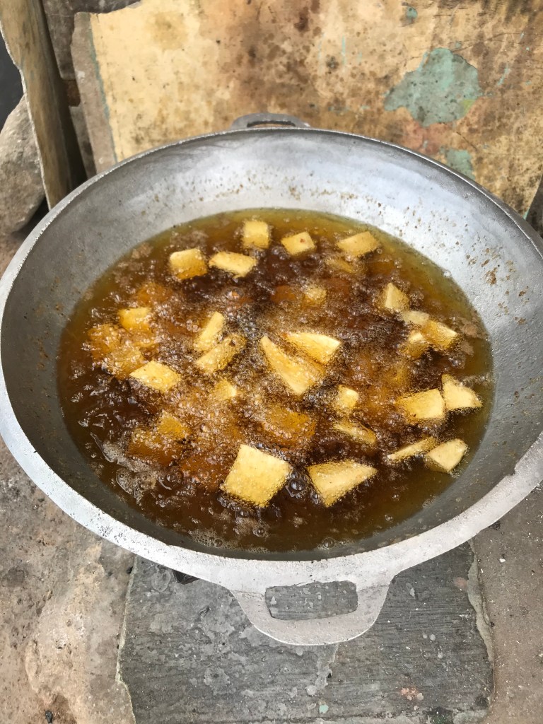 It is nearing midday now and we are a little hungry so we stop at a lady who is selling yam chips on the side of the road.