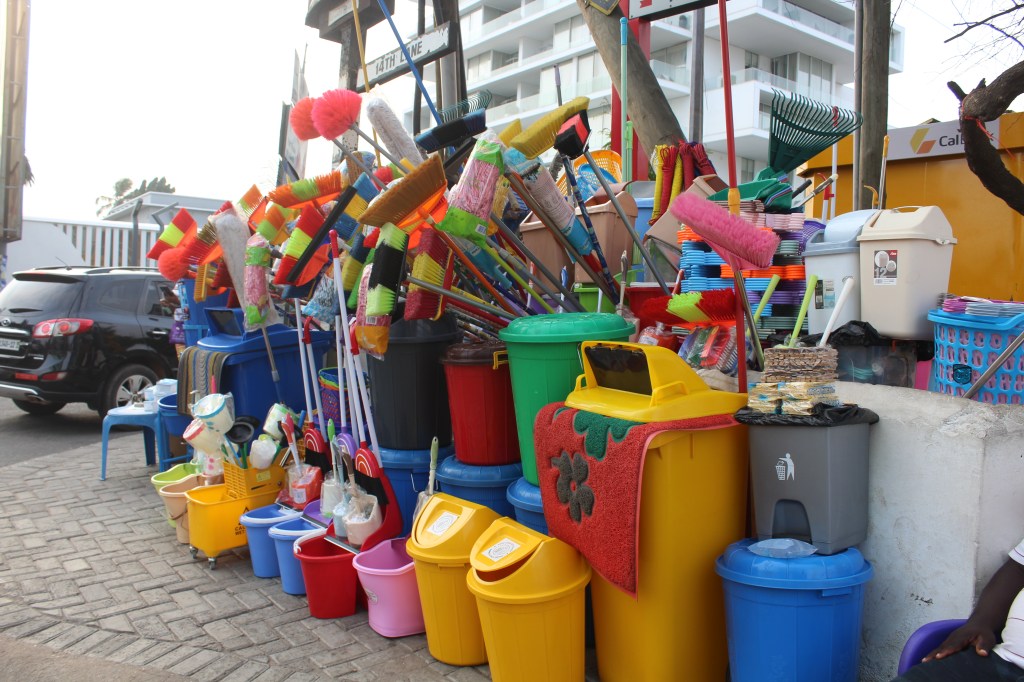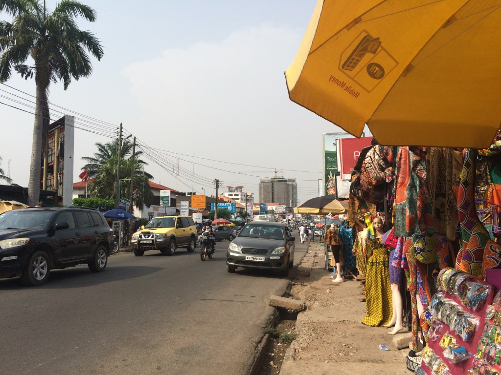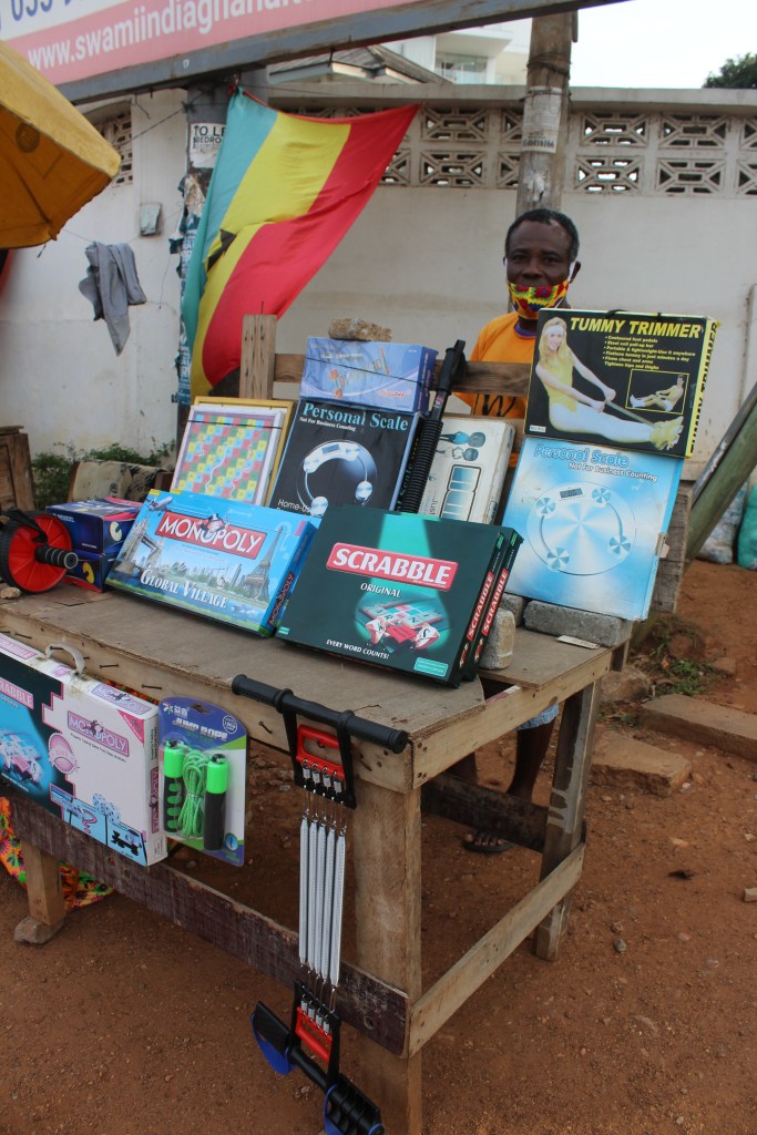 It is also a nice street to take visitors to, to get a feel for what energetic street life in Accra is like. If you walk it with curiosity and eyes wide open, you will enjoy its quirks like the fact that you can buy a wide variety of things from the pavement vendors such as tie dyed t-shirts, fresh fish on ice, dog leashes and muzzles (these make me a bit sad), walking sticks, ‘tummy trimmers’, country flags, small plants and Scrabble and Monopoly!