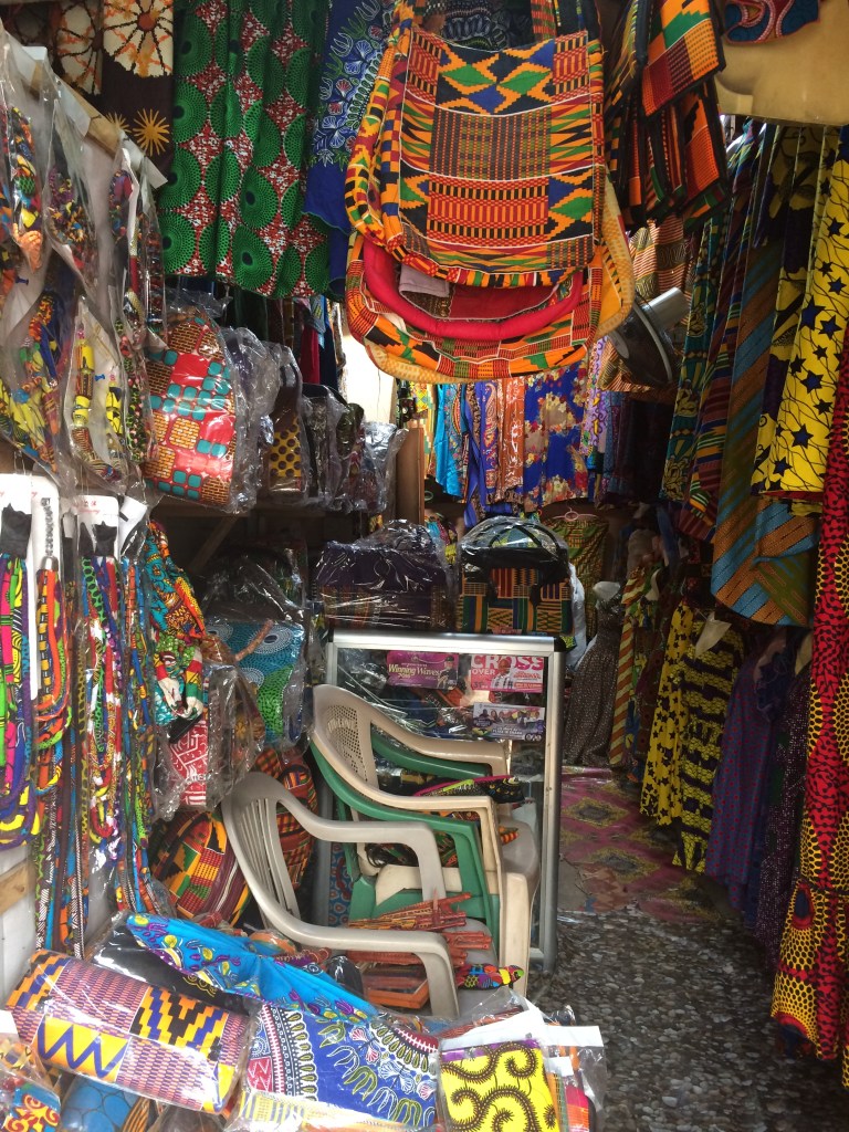 For quite a long stretch towards Shoprite there are many little roadside stores selling all sorts of cheerful looking Ghanaian goods, you can’t miss them because the colours of the African wax fabrics will jump out at you. Clothing, backpacks, key rings and beaded items are some of the things on sale, as well as fabric fans. These are also available at the weekend markets, but I’ve always bought mine here. They are not only pretty, but very effective in the hot and humid Ghana weather and in my mind are a necessary handbag item!! The shop owners can be quite persistent at trying to get you to ‘just look’ at their wares on sale so be prepared for regular calls to try to get your attention. There are also insistent men who walk along here wanting your name so that they can make you a personalized bracelet and men wanting you to look at their artworks they have draped over their arms or in a shop close by. You need to be equally adamant when telling them to leave you alone if you don’t want to be hassled!