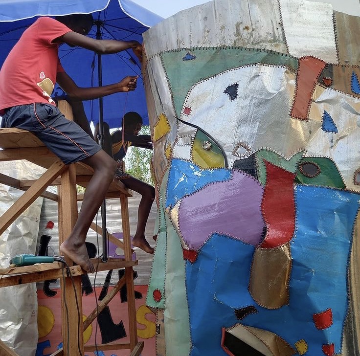Tei works in many different mediums and also does Acrylic paintings which can be seen on his Instagram. At the time of me chatting to him he was still to add the final 50 metres to the 30 metres that we had seen that day, making the soon to be finished artwork an impressive 80 metre piece hanging on the road wall. He told me that it had taken him 3 months to make the initial 30 metres. The mediums he uses are aluminium metal sheets, copper wires and metallic spray paint. There are many work in progress photos and videos on his Instagram of this metal piece being made by himself and ‘his sons’, who he frequently credits for their contributions and hard work. During the Covid lockdown in Ghana work went on as usual for them and it was all hands on deck to finish the piece. In some shots they are sitting on scaffolding under umbrellas to shield them from the hot equatorial sun.