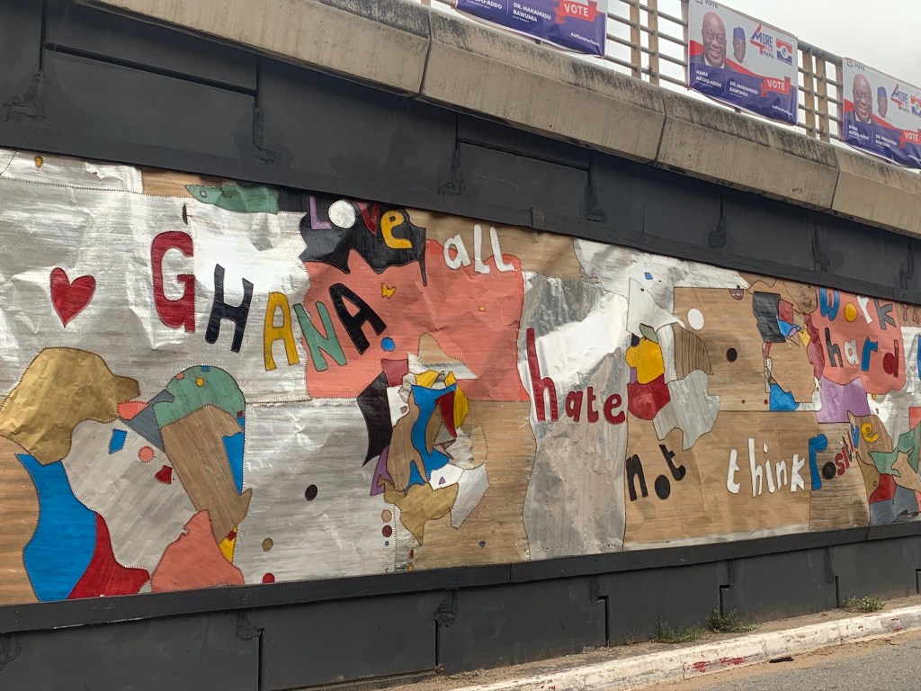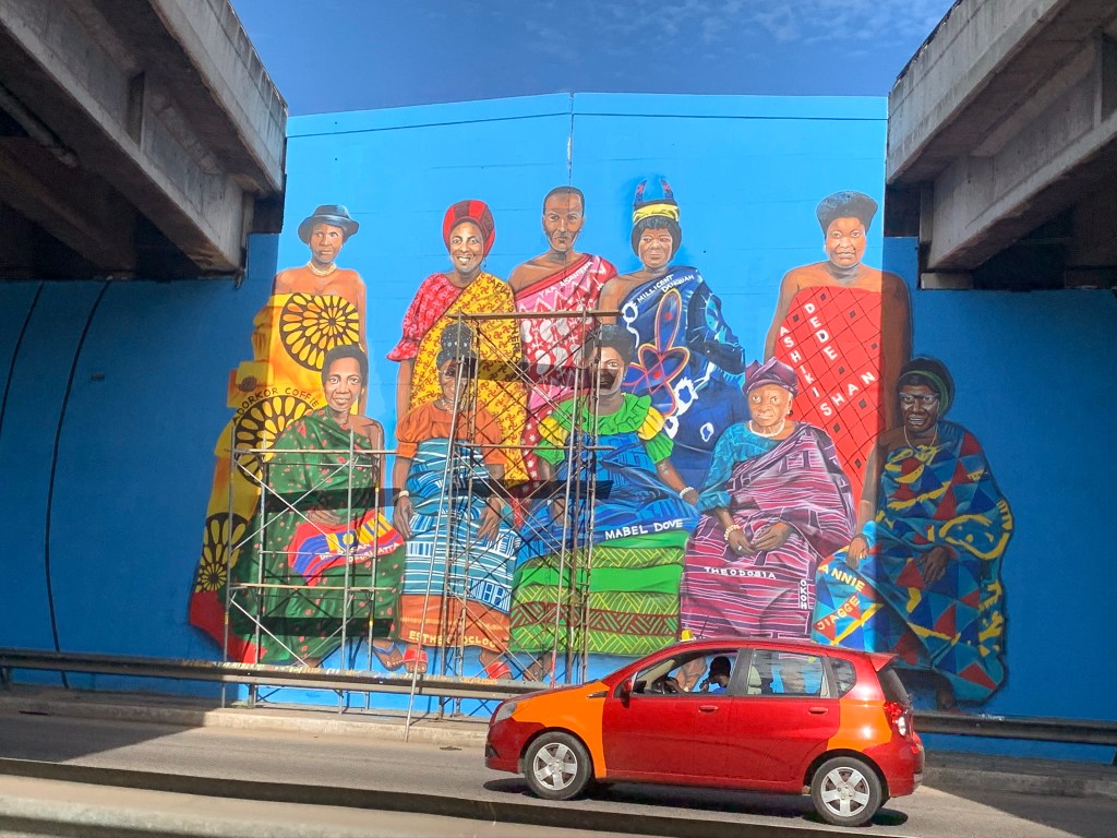 Along with the bold African wax fabrics you see everyone wearing here, these artworks really brighten up the Accra environment. It all started with this mural in Airport area about a year ago that was painted on the side of one of the bridges. Popular motifs that you see on wax fabric have been included and are instantly recognisable.