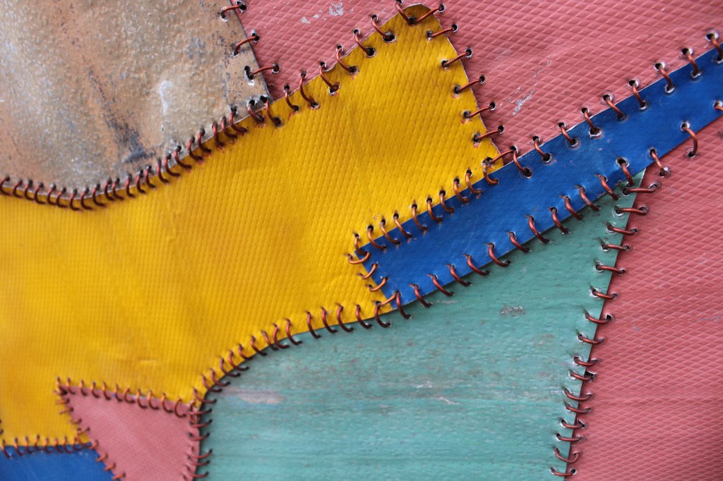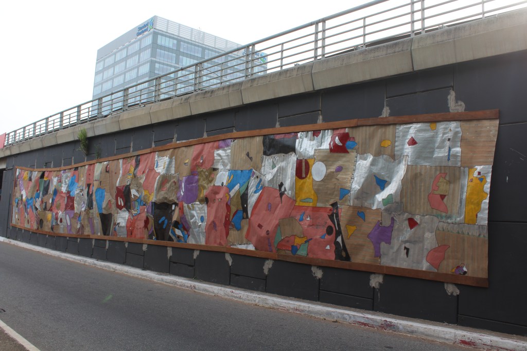 I stand on the narrow ledge of pavement and I’m highly aware of the loud late afternoon traffic with trotro’s (mini bus taxis) and cars hurtling past, all a little too close for comfort. I run my hands along these pieces of warped metal and looking up, try to take in this colourful piece in front of me. A tiny part of this elongated artwork that has been erected on a wall on the side of an exit road of a very busy ‘round about’. I’m fascinated by the different textures, shapes and details on it, it is unusually wonderful with its bumpy tactile quality and has been painted in happy bold colours.