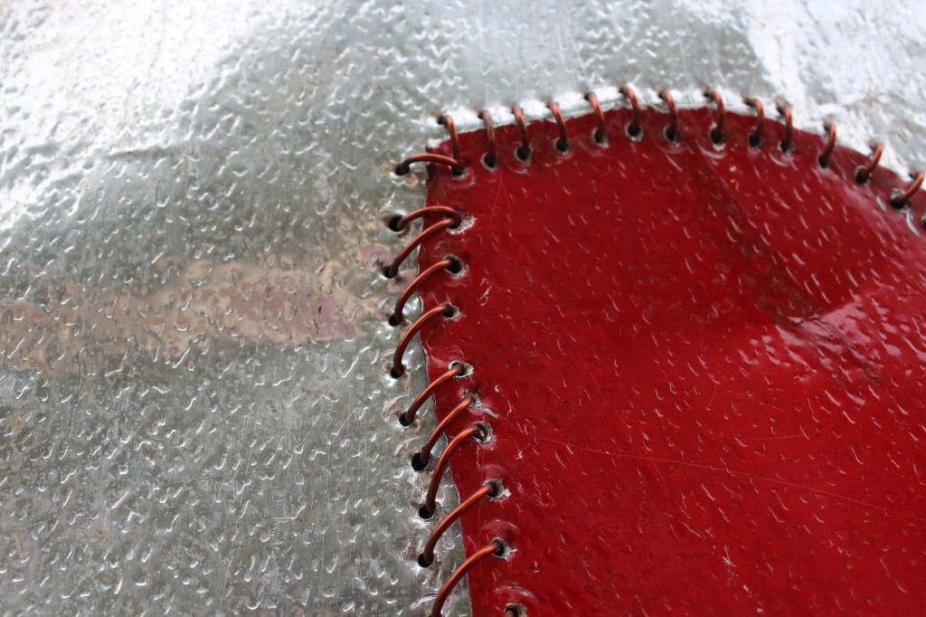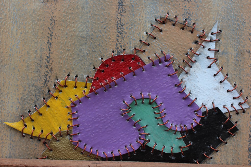 The tiny metal hoops used to join the metal pieces together are so miniscule compared to the scale of this massive piece. I wonder how long it takes the artist to insert them?…..how many hundreds of hoops he has used in this piece?….. how he handles all this stiff metal and merges and blends it together? It makes me think of a designer leather bag I saw recently by South African brand Missibaba with various shapes of dyed leather stitched together, but this has irregular pieces jutting out, joined to other pieces by these copper coloured loops. There must be hundreds of them. They remind me of the small hoop sleeper earrings I used to wear when I first had my ears pierced as a tween!