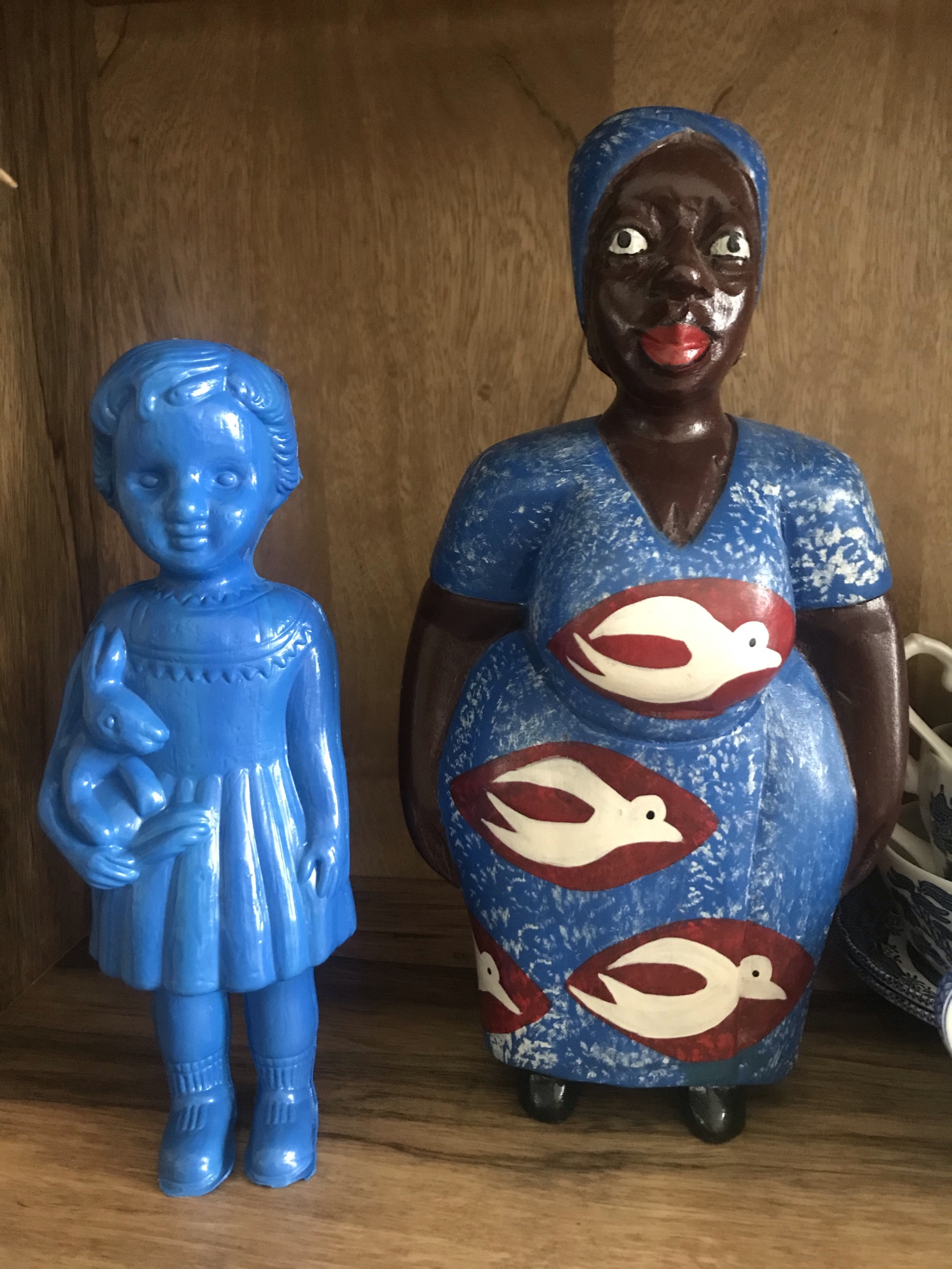 A blue Clonette Doll stands on our bookshelf next to a Ghanaian wooden figure of a woman.